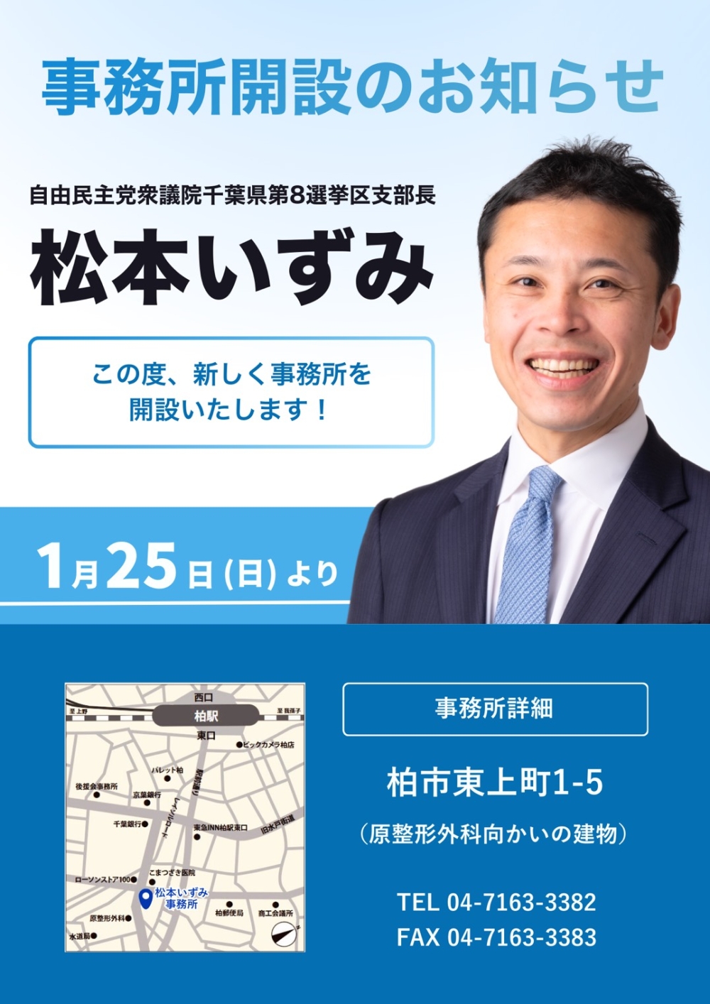 この度、以下の通り新しい事務所を開設することとなりました。 1月25日(日)以降に稼働する予定ですので、お近くにお越しの際には、是非お気軽にお立ち寄り頂けますと幸いです。 住所:柏市東上町1-5(JR柏駅東口から徒歩9分、原整形外科さんの向かい) TEL 04-7163-3382 FAX 04-7163-3383 Email : info@matsumoto-izumi.jp