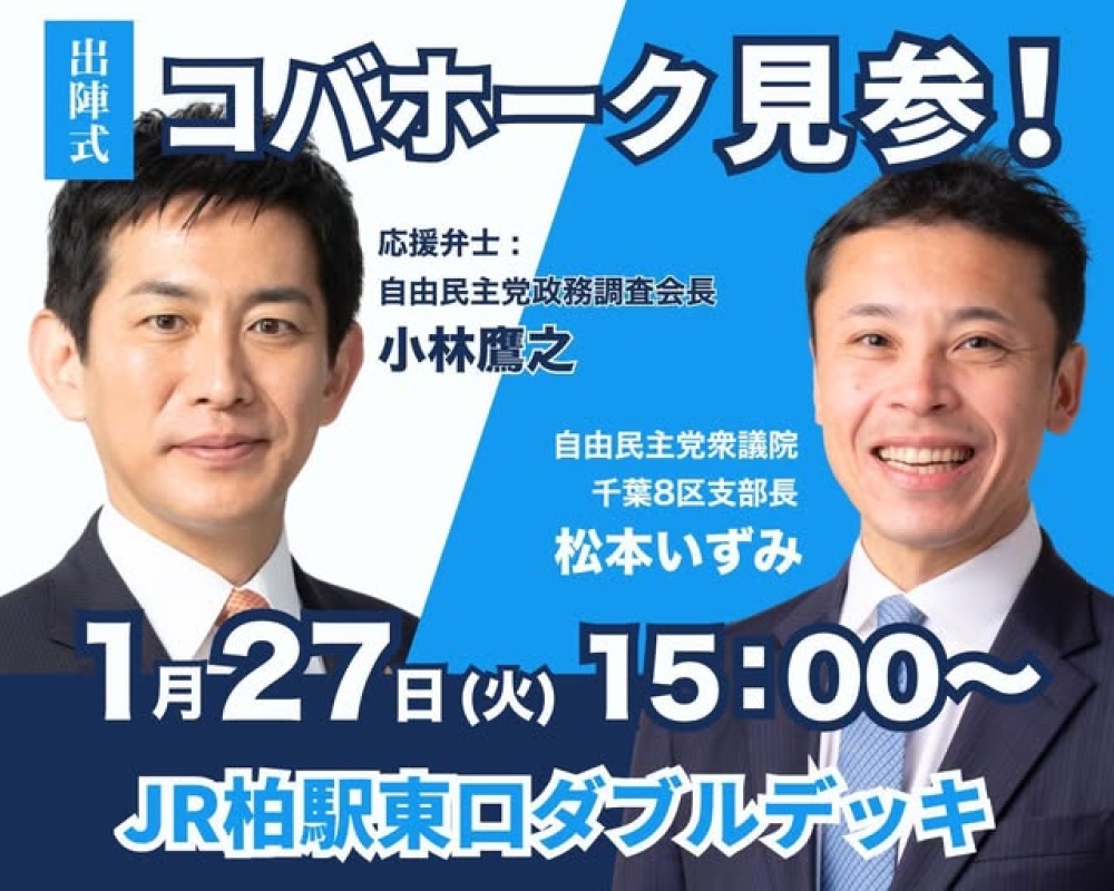 本日1/27(火)15時に、JR柏駅東口にて出陣式を開催いたします。 出陣式には、松本いずみが日々大変お世話になっております、コバホークこと、小林鷹之自民党政調会長にもお越し頂く予定となっております! https://www.youtube.com/shorts/DS59cEQGoHY <開催概要> 日時:1月27日(火) 15:00〜 場所:JR柏駅東口ダブルデッキ ...