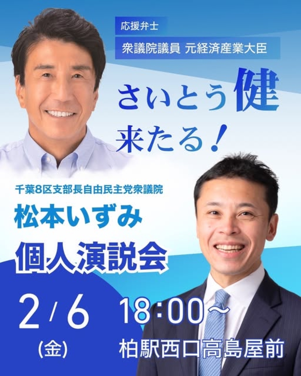 明日2/6(金)にJR柏駅西口高島屋前にて個人演説会を開催いたします。応援弁士に元経済産業大臣 さいとう健 衆議院議員にもお越し頂く予定となっております! <開催概要> 日時:2月6日(金) 18:00〜 場所:JR柏駅西口高島屋前 応援弁士:さいとう健氏(元経済産業大臣) お一人でも多くの方に足をお運びいただけましたら幸いです!